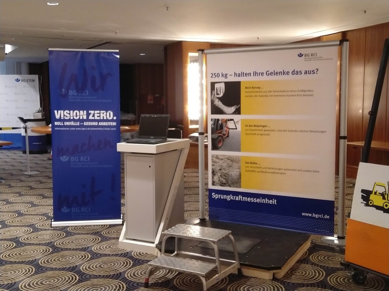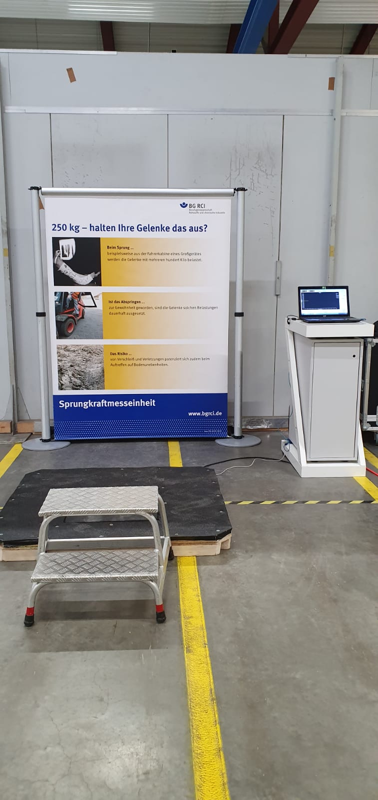 Haben Sie auch viele Stolperunfälle oder Stürz- und Rutschunfälle in Ihrem Unternehmen/Betrieb? Bei dieser Sprungkraftmesseinheit werden die Kräfte visuell dargestellt, die beim Sprung auf das Muskel- und Skelettsystem einwirken. Bei der Übertragung auf die Arbeitswelt wird beispielsweise der Sprung aus der Fahrerkabine einer Einschienenhängebahn oder der Sprung von einer Materialgondel simuliert oder auch der Sprung von der Ladefläche eines Lastkraftwagens oder von einem Stuhl. Moderiert und kommentiert wird die Sprungkraftmesseinheit von einer sachkundigen Person, die Schwingungsdiagramme lesen und auswerten kann.