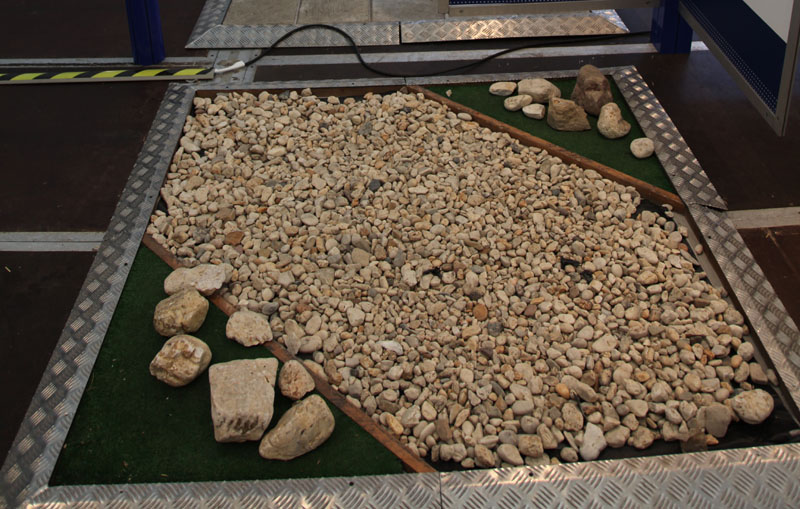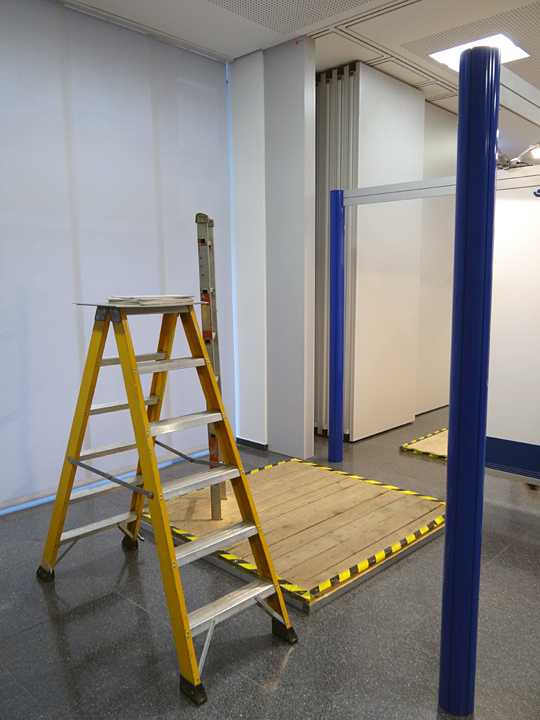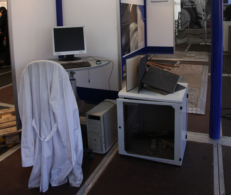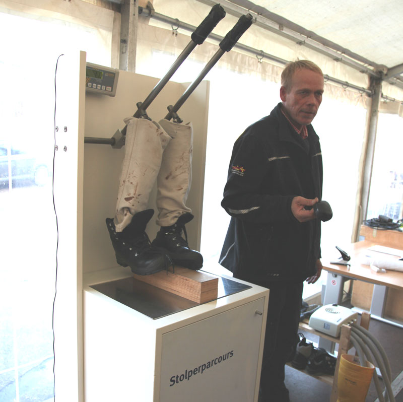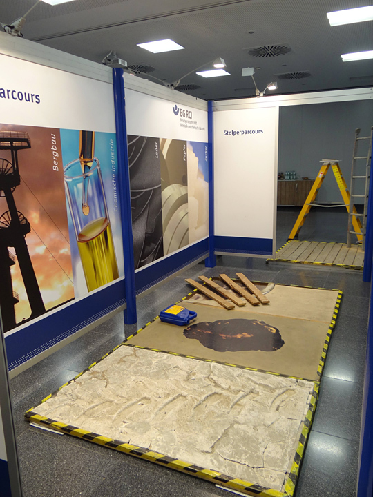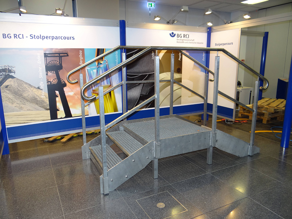 Der Stolperparcours besteht aus mehreren Modulen und zeigt verschiedene Situationen auf, die im betrieblichen Alltag zu Stolper-, Rutsch- und Sturzunfällen führen können. Unterschiedlich hohe Treppenstufen, defekte Geländer, liegengelassene Gegenstände und ungeeignete Bodenbeläge sind jeden Tag mögliche Ursachen für folgenschwere Unfälle. Der Parcours soll dabei helfen, den Blick für gefährliche Situationen im Alltag zu schärfen, um den Prozess der Bewusstseinsänderung bei den Mitarbeitern zu unterstützen. Für den Stolperparcours werden insgesamt neun Module (Detailinfos über die Module) angeboten, von denen Sie im Laufe des Bestellprozesses sechs nach den individuellen Bedürfnissen Ihres Unternehmens auswählen können. Erforderliche Gegebenheiten für den Aufbau: