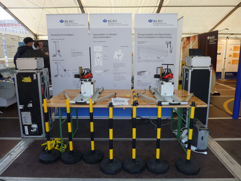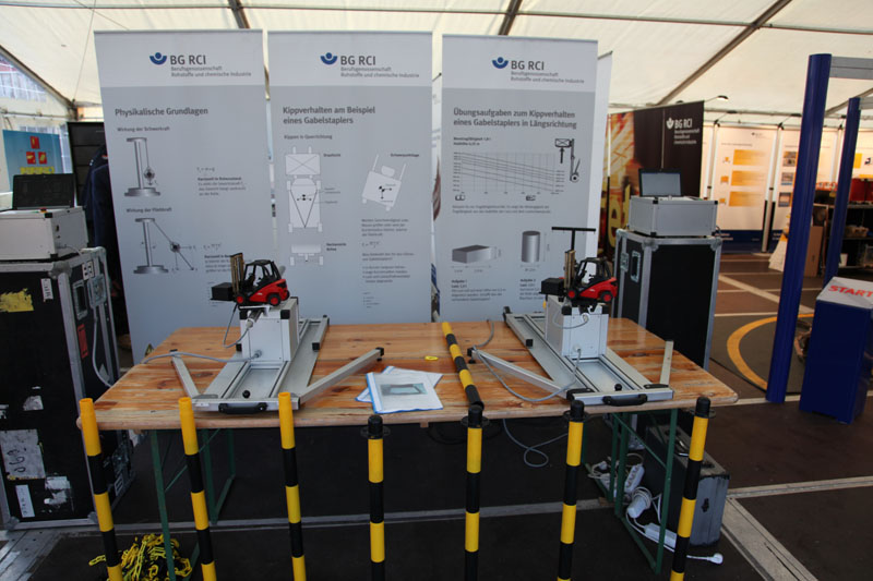 Leider kommt es beim Umgang mit Gabelstaplern immer wieder zu schwersten Unfällen. Vielfach werden dabei die auf einen Gabelstapler wirkenden Kräfte, die aus Last, Lasthöhe, Geschwindigkeit und dem Kurvenradius resultierenden Kräfte unterschätzt. Dies führt bei Kurvenfahrten häufig dazu, dass Gabelstapler umkippen. Das Fliehkraftmodell veranschaulicht eindrucksvoll die wirkenden Kräfte und zeigt die Folgen von zu schnellem Fahren in verschiedenen Situationen auf. Im Modellversuch können realitätsnah und dennoch völlig ohne Risiko der Einfluss der Parameter