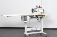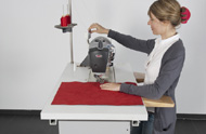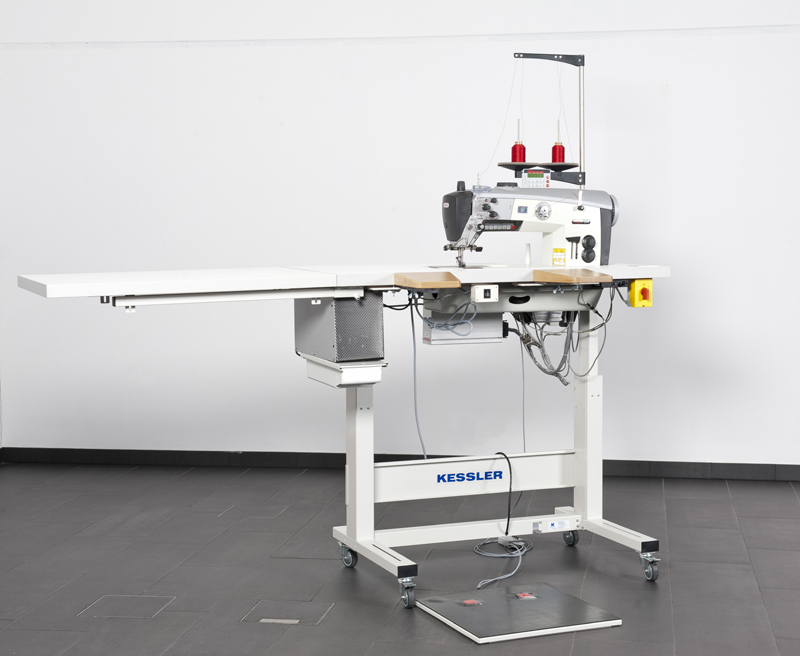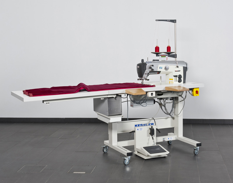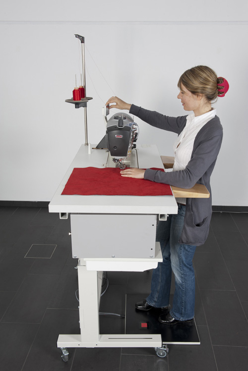 Ergonomischer Arbeiten durch individuelles Anpassen! Bei Nichtbeachtung ergonomischer Grundsätze kann es zu Belastungen des Muskel-Skelett-Systems kommen, die Beschwerden und Erkrankungen zur Folge haben können. Die Vorteile des vorgestellten Aktionsmediums sind nachfolgend kurz zusammengefasst. Das höhenverstellbare Gestell ermöglicht es allen Personen, die in einem Betrieb nähen, die Nähmaschine auf die für sie optimale Arbeitshöhe einzustellen. Dies setzt einen höhenverstellbaren Arbeitsstuhl voraus, der eine Anpassung an die Körpergröße der Person ermöglicht. Dadurch dass die Arbeitsplatte mit dem im Gestell eingebauten Elektromotors sehr weit nach oben gefahren werden kann, ist auch ein Arbeiten im Stehen möglich. Dies empfiehlt sich immer dann, wenn man über längere Zeit nähen muss. So kann ein Wechsel zwischen sitzender und stehender Tätigkeit vorgenommen werden. Der erweiterte Fußraum wurde dadurch erreicht, dass eine breitere Traverse eingesetzt wurde und der Antrieb der Maschine nicht im Kniebereich positioniert ist. Eine weitere ergonomische Verbesserung sind die zusätzlichen Armauflagen. Diese ermöglichen es, die Arme beim Nähen abzulegen. Die Armauflagen lassen sich verstellen und können je nach Bedarf auch ganz entfernt werden. Die Vorteile der beschriebenen Optimierungen lassen sich natürlich am Objekt selbst am besten vermitteln. Der ergonomisch optimierte Näharbeitsplatz kann daher im Betrieb im Alltag getestet werden. Der Näharbeitsplatz kann in Ihrem Betrieb aufgestellt werden, damit Sie und Ihre Mitarbeiterinnen und Mitarbeiter selbst erkennen, welche der vorgestellten Verbesserungsmöglichkeiten vielleicht auch an Ihren Nähmaschinenarbeitsplätzen realisiert werden können. Hinweis: Der Näharbeitsplatz ist mit einer Industriemaschine ausgestattet, mit der insbesondere Polsterstoffe und ggf. dickere Dekorationsstoffe genäht werden können. Für das Nähen von klassischen Dekostoffen ist diese Maschine ungeeignet.