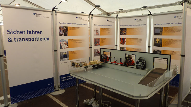 Mit dem Gabelstaplermodell werden verschiedene Situationen im betrieblichen Alltag dargestellt. Der Besucher bedient unter Anleitung eines Moderators mithilfe einer Fernsteuerung ein Gabelstaplermodell. Die Aufgabe für den Besucher besteht darin, Material aus einem Regalsystem auslagern, das Material über eine schiefe Ebene zu verfahren und auf einem Sattelauflieger abzusetzen und umgekehrt. Ziel ist es hierbei, fahrphysikalische Grenzen und Besonderheiten im Umgang mit dem Gabelstapler aufzuzeigen. Das Modul thematisiert die 4 Bereiche: