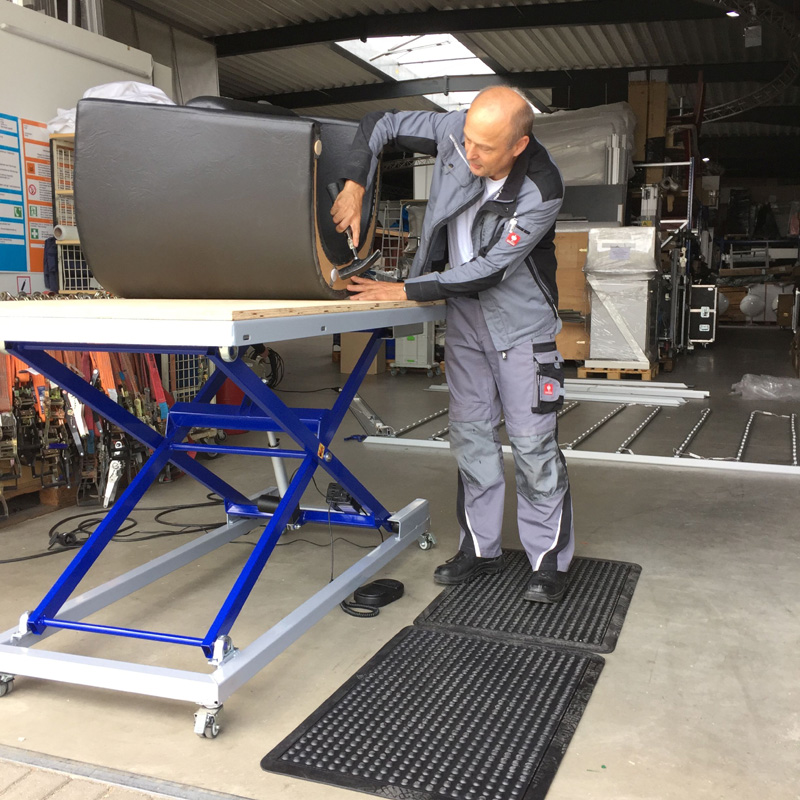 Immer dann, wenn über längere Zeit keine ergonomische Arbeitshaltung eingenommen werden kann, besteht die Gefahr dass es zu Beschwerden des Muskel-Skelett-Systems kommen kann. Nicht selten führen diese Beschwerden dann auch zu Fehlzeiten der betroffenen Person. Um solchen Belastungen vorzubeugen, bietet die BG RCI einen höhenverstellbaren Werkstattarbeitsplatz an, der ein an die Arbeitsaufgabe und Größe der Person angepasstes Arbeiten in optimaler Arbeitshöhe ermöglicht. Die Vorteile des höhenverstellbaren Werkstattarbeitsplatzes kurz zusammengefasst: Der höhenverstellbare Werkstattarbeitsplatz ermöglicht allen Personen, die in Ihrem Betrieb arbeiten, diese Tätigkeit in einer optimalen, ergonomischen Arbeitshöhe auszuführen. Durch den im Scherenhubtisch eingebauten Motor kann z.B. ein Polsterer das Gestell in die richtige Arbeitshöhe fahren und rückenschonend arbeiten. Der Fußschalter kann dabei durch den Beschäftigten variabel in die für ihn günstigste Position gelegt werden. Die zum Aktionsmedium mitgelieferten Ergomatten ermöglichen ein rückenschonendes Arbeiten. Die Vorteile des Scherenhubtisches lassen sich natürlich in Ihrem Betrieb bei Ihren typischen Tätigkeiten am besten erkennen. So können Sie selbst und Ihre Beschäftigten ausprobieren, welche Vorteile ein höhenverstellbarer Werkstattarbeitsplatz im täglichen Arbeitsalltag mit sich bringt. |